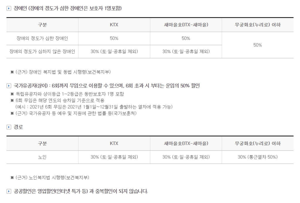 코레일 회원 중 기초생활수급자는 역 창구에서 기초생활수급자증과 신분증을 제시하고 완전인증(등록)하고 KTX 열차별 승차요금에 따라 좌석을 30% 할인해 주며, 새마을, ITX 청춘, 무궁화. 할인 가능합니다. 이 할인은 등록일로부터 1년 동안 유효하며 그 이후에는 재등록해야 합니다.