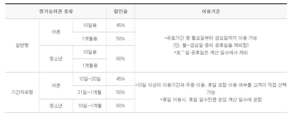 코레일은 정기적으로 열차를 이용하시는 분들을 위해 정기권을 운영하고 있습니다. 본 정기권은 정기권과 정기권으로 구분되며 유효기간 내 1일 2회(왕복) 이용이 가능합니다. 이용 시 45%~60%의 요금할인을 받으실 수 있습니다.