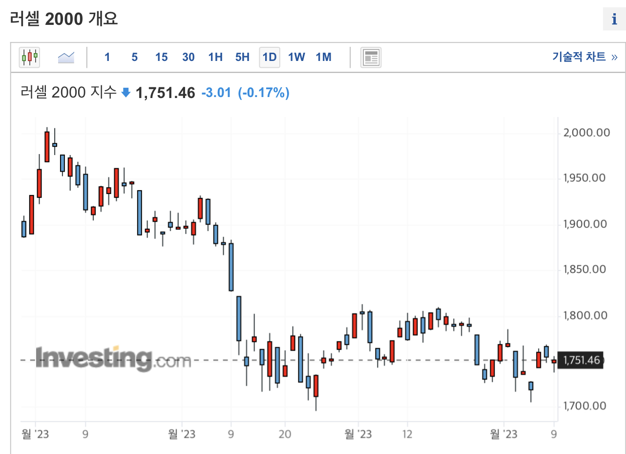 지난 9월 18일 미국 빅컷 금리 인하 이후 사실상 하락세를 보이고 있다. 2024년 10월 11일 현재 러셀의 주가는 2,188.42입니다. 52주 최저가는 1,633.67~2,300으로 고점에 근접했다.
